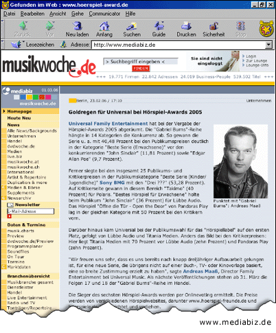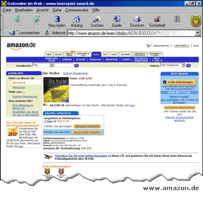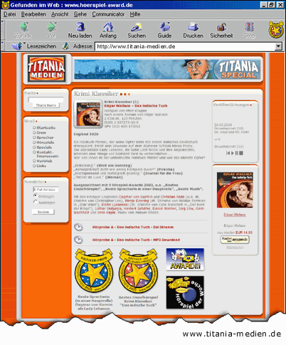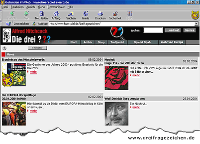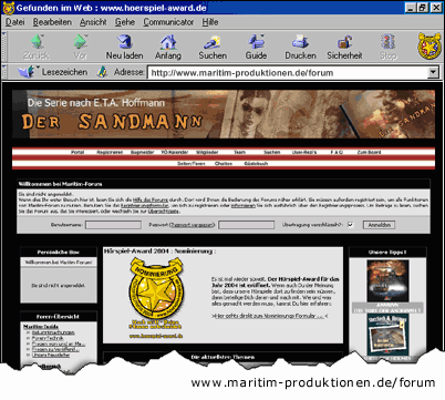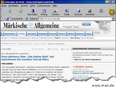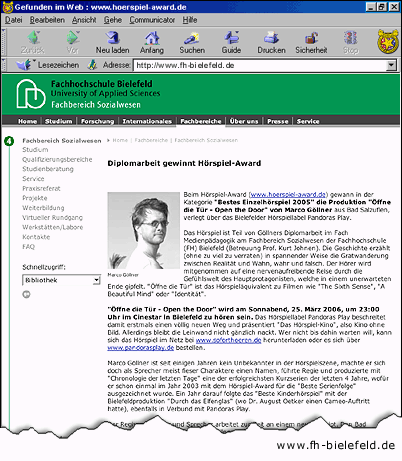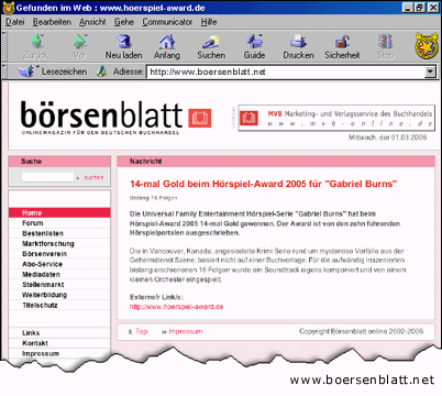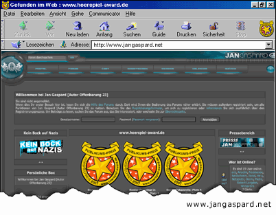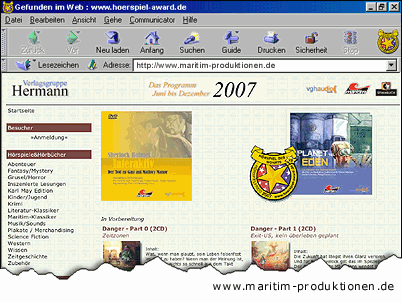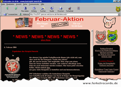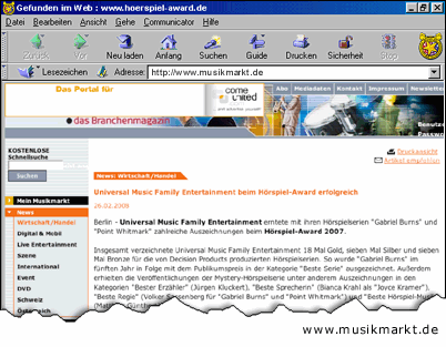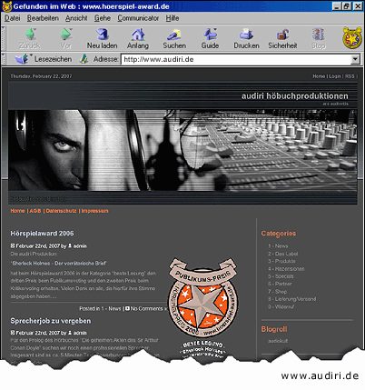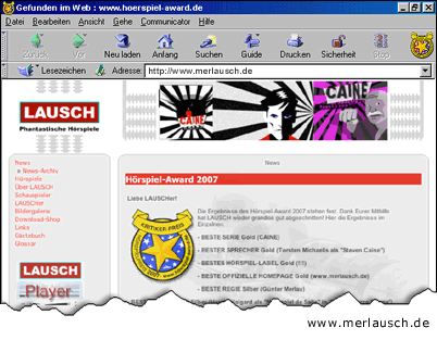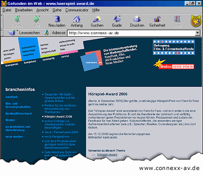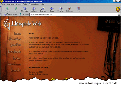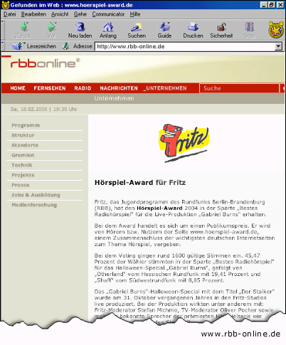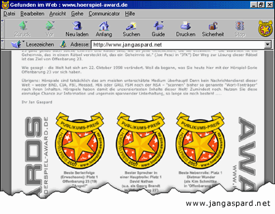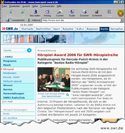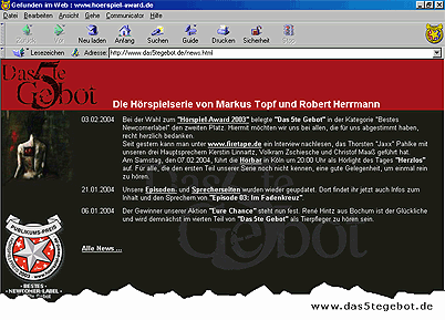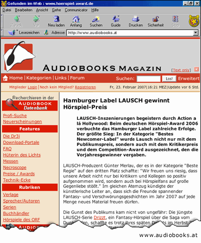 Der Hörspiel-Award findet von Jahr zu Jahr mehr Beachtung! - Daher möchten wir Euch (als Entscheidungsträger) deren 'Links' nicht vorenthalten. Wenn Ihr einen Link findet: Dann mailt uns doch bitte! |