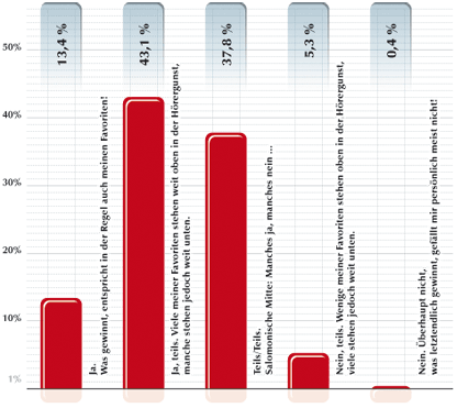 Findest Du, daß die Ergebnisse des Hörspiel-Awards ein gutes Abbild Deiner eigenen Meinung sind ? (Sofern Du das erste Mal teilnimmst, kannst Du Dir ja nochmals die Ergebnisse der vorherigen Jahre ansehen - und Dir eine Meinung bilden.)