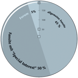 Die Ergebnisse der Umfrage können generell unterteilt werden in · kommerzielle Webseiten (zumeist Label-Webseiten) und · private Fan-Webseiten - wobei die privaten Fan-Webseiten wiederum unterteilt werden können in · allgemeine Hörspiel-Webseite · Hörspiel-Forum · Hörspiel-Webseite mit "Special-Interest" (in der Regel eine Webseite, Forum zu einer bestimmten Serie) und · Sonstige Besuchte Websites : Unterscheidung in kommerzielle Webseiten oder private Fan-Webseiten :
